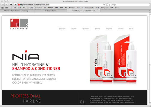 Wrote and designed for websites, ads, booklets and packaging, 2007 to 2014: Covered common dermatological complaints such as acne, dandruff, wrinkles and hair loss, and treatments such as antioxidants, retinoids and minoxidil. When the primary distribution channel changed from online retail to hair salons, a simpler style of copy and design was required. In 2013, responsibilities expanded to include art direction and production in addition to writing and editing.