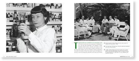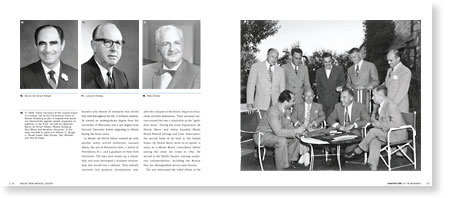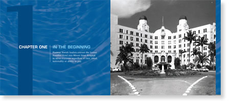 The book begins with the founding of Miami Beach and its first hospital for Jewish patients and physicians. In 192 pages, it covers Mount Sinai's evolution into the city's leading medical center. A few typical spreads are shown below.