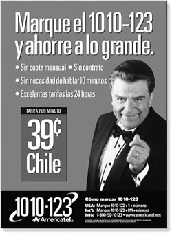 Created collateral materials in US English to market business-to-business services. Then the company launched a campaign of events, direct mail and television featuring Latin TV personality Don Francisco, selling prepaid, dial-1 and 1010-123 dial-around services to US Hispanics. Created and produced the print to support the new services, in Spanish.