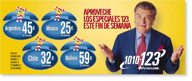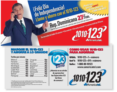 Designed cultural-affinity mailers for 16 Latin countries, pitching 1010-123 dial-around access for long distance. Mailed the cards to millions of US Hispanics based on their international calling patterns. Click for a PDF file of Argentina, Bolivia, Chile, Colombia, Costa Rica, Cuba, Dominican Republic, Ecuador, El Salvador, Guatemala, Honduras, Mexico, Nicaragua, Paraguay, Peru, Uruguay, Venezuela, the generic front, the Portuguese back or the Spanish back.