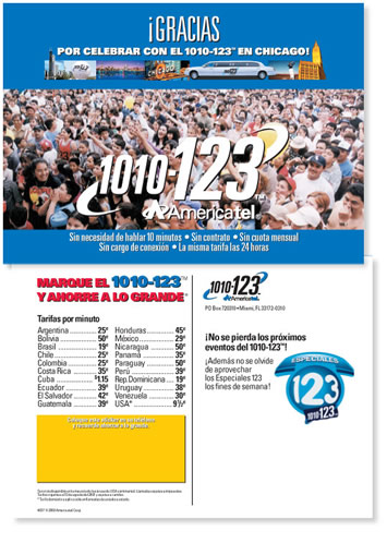 DIRECT-MAIL Americatel sponsored cultural festivals in Hispanic markets of the United States and built a database of people who registered for the premiums. Designed and produced cards with piggyback labels to follow up the events and mailed millions into Miami, Chicago, Texas, Los Angeles, New York and Washington. Designs changed every few months. Rates changed every few weeks. Lists changed constantly. Traffic increased briskly. Click the images at right for PDF samples.